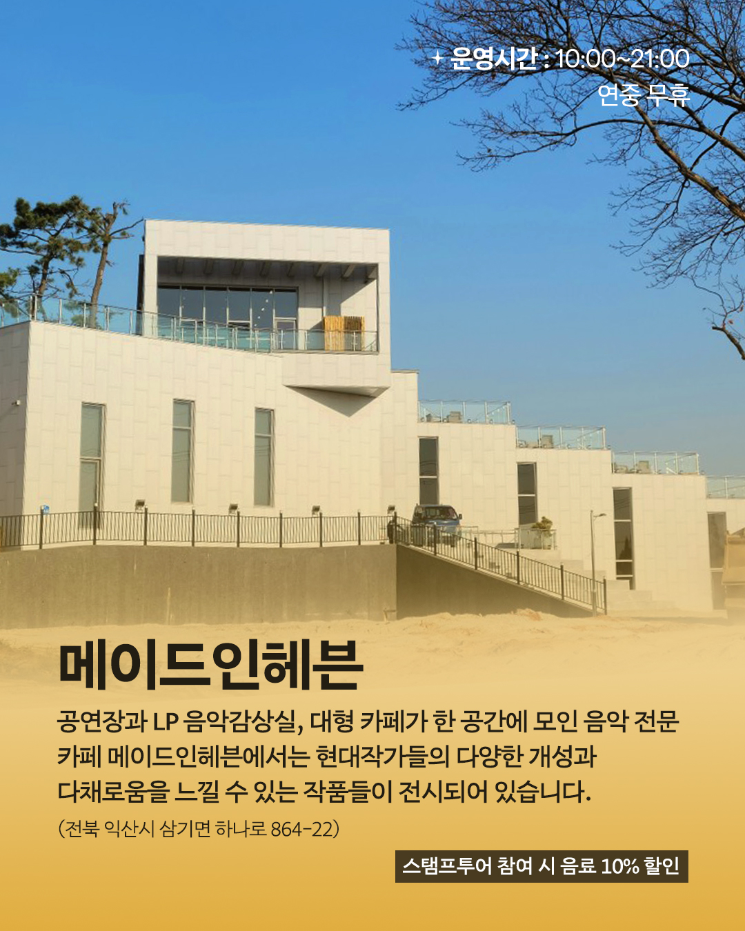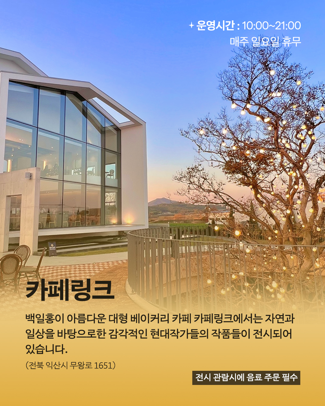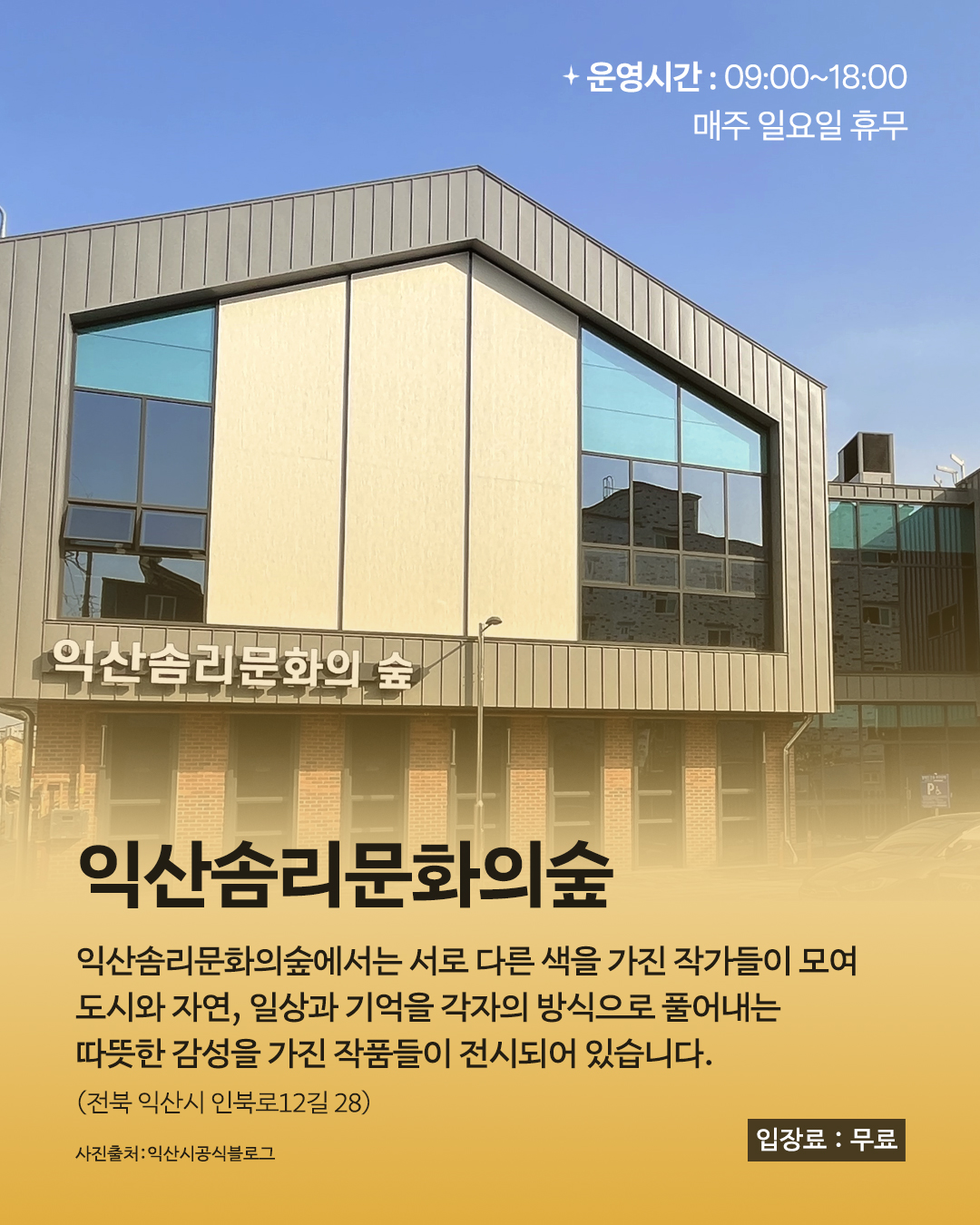 일요일은 ‘솜리 문화의 숲’과 ‘카페 링크’ 휴무로, 해당 공간은 방문 인정됩니다.운영 시간은 공간별로 상이하니 방문 전 확인해 주세요.