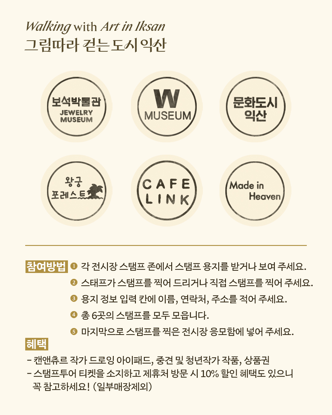 익산 곳곳의 전시 공간을 방문하며 스탬프를 모아보세요.